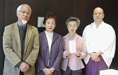 報徳二宮神社(草山明久宮司)で1月に開催された有名人慈善絵馬展の収益金33万218円が3月17日、毎日新聞東京社会事業団に寄付された。絵馬展には今年269点が出品され、2500人を超える人が訪れた。寄付は33回目となり、神社を代表し丸山佐智子さんから毎日新聞社小田原支局の澤晴夫支局長へ、目録が手渡された。