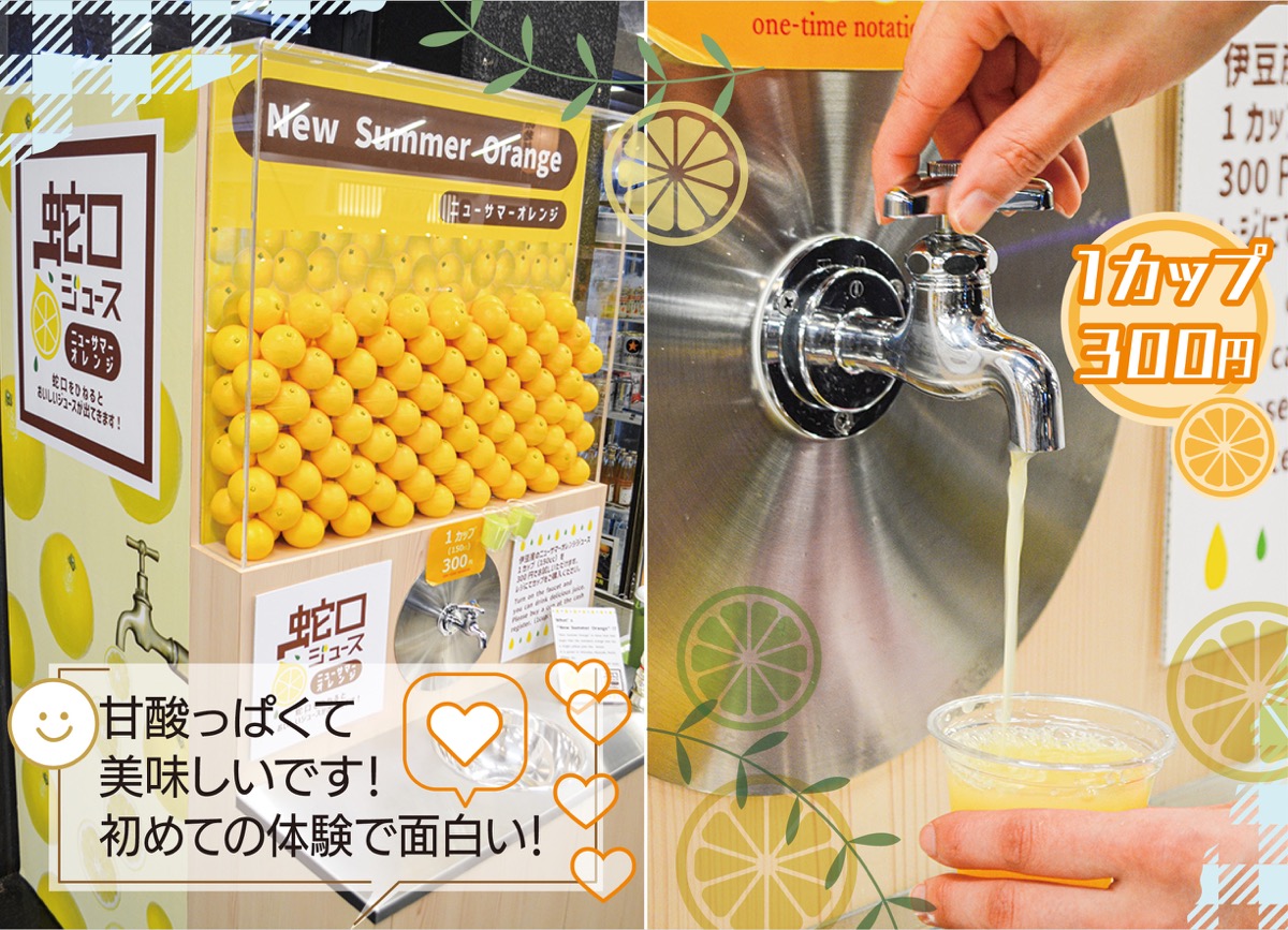 テレビで注目の「蛇口ジュース」が箱根関所旅物語館に設置され話題を呼んでいる。伊豆産ニューサマーオレンジが蛇口から出る珍名所。「箱根神社参拝時にはぜひお立ち寄りください」