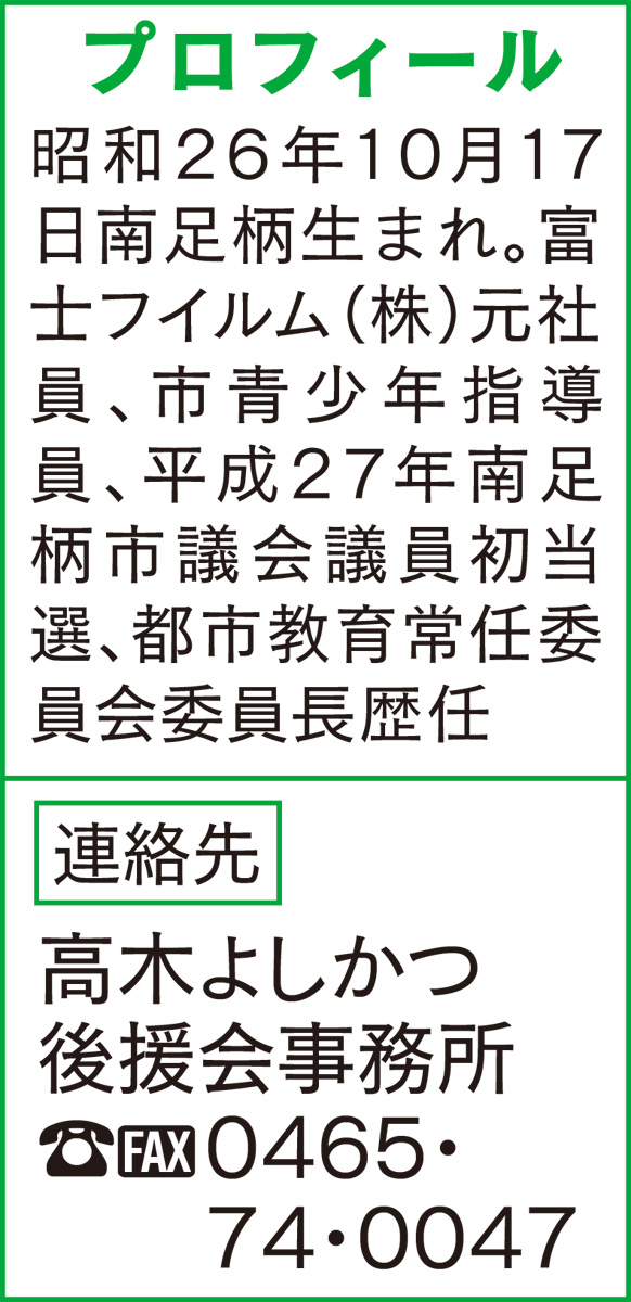 4年の経験を活かし、自民党とのパイプを持つ「高木よしかつ」は、明るい未来のために、その先頭に立ちます!