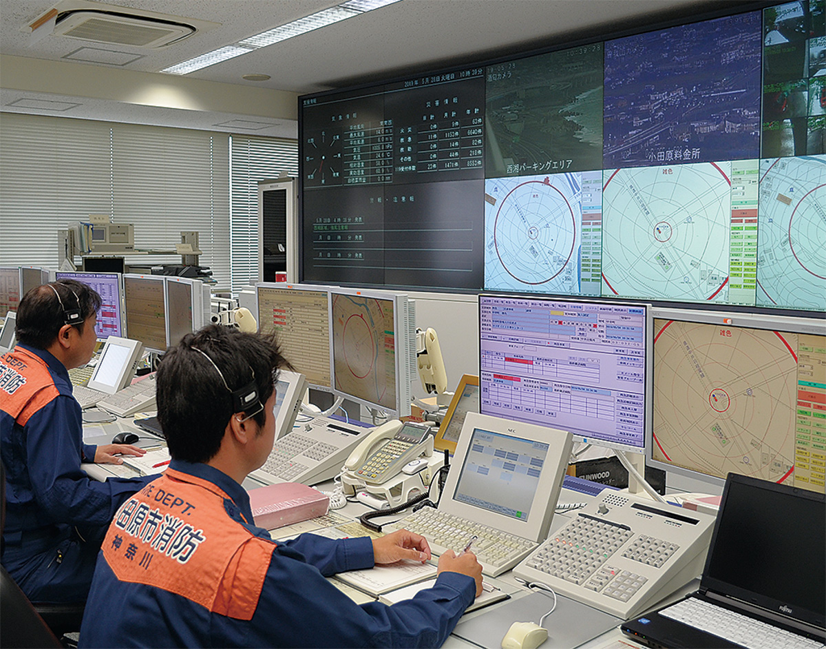 導入したのは民間の電話センターによる通訳サービス。119番通報をすると同本部指令センター(小田原市前川)で受け、外国語の場合はサービスにつないで3者通話を行う。サービスは24時間365日稼働し、英語、韓国語、中国語、ポルトガル語、ベトナム語、タガログ語、インドネシア語、フランス語、ロシア語など17カ国語に対応。同時通訳で病状、火災状況、所在地などを聞く。搬送などを行う隊員も携帯電話に機能を導入し、搬送中にも3者通話ができるよう対応する。