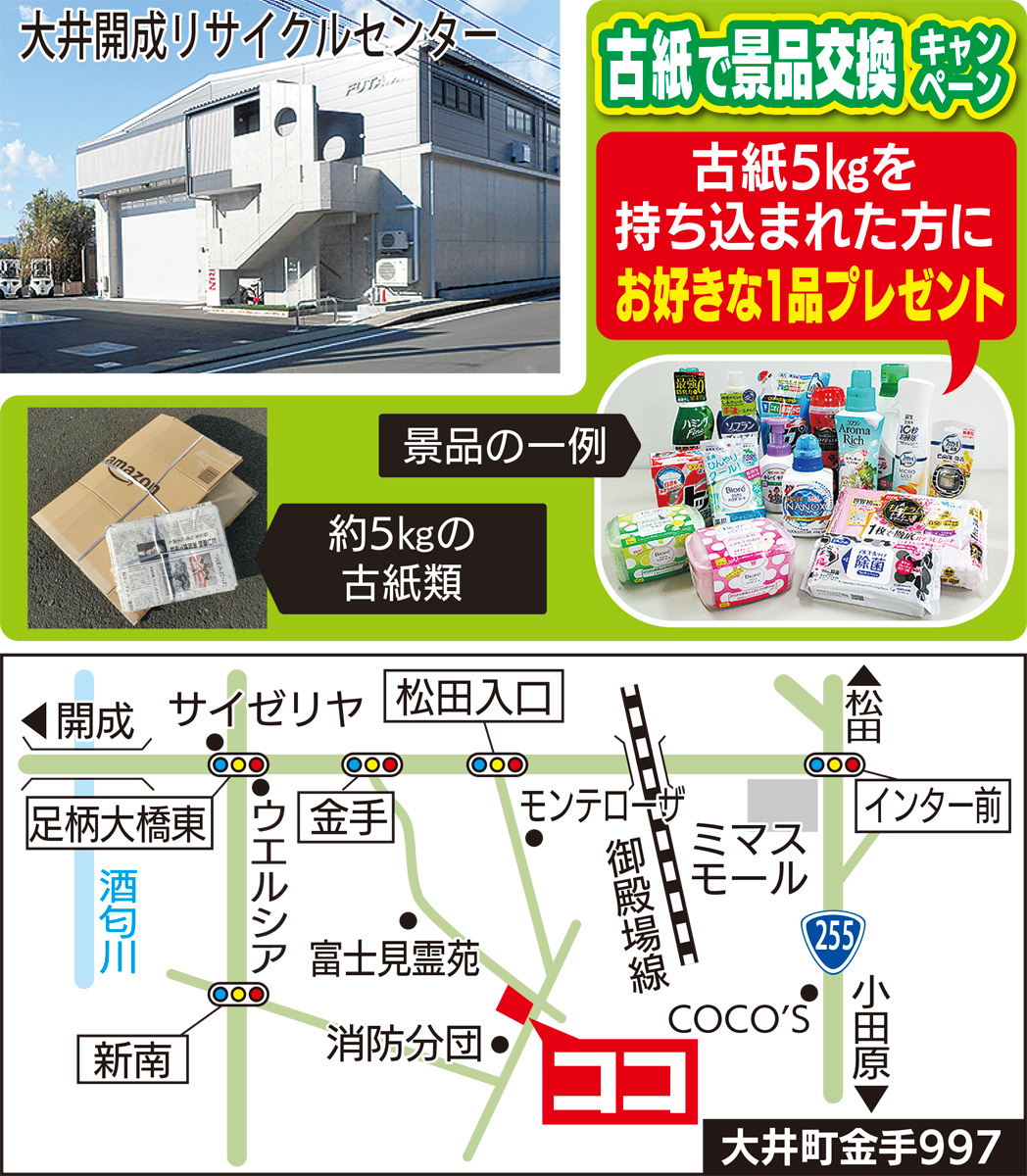 そんなお得なサービスが評判の「大井開成リサイクルセンター」。持ち込みは月曜〜土曜。車で乗り入れできて、スタッフが荷下ろしをしてくれる。もしも車で運べない場合でも、「開成町・大井町内」なら無料で出張回収してくれるから便利。景品は無くなり次第終了となるのでお早めに。空き缶と衣類の引取りも承り中。
