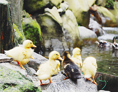箱根の天成園で先月29日にアヒルのヒナ9羽が生まれた。親鳥を追って岩を飛び回り、池を泳ぐ愛らしい姿が観光客の注目を集めている。これまでは卵がふ化すると親鳥が育児放棄してしまいホテルスタッフが餌を与えていた。今回は”育児熱心”な親鳥がヒナのそばを離れようとしないという。杉崎芽富副支配人は「アヒルはホテルのシンボル、無事に育って欲しい」と話していた。