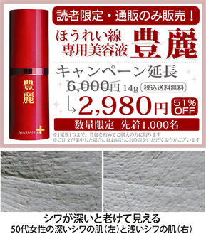 聖マリアンナ医科大学の皮膚科学研究から生まれた(株)ナノエッグの化粧品シリーズ『マリアンナプラス』のほうれい線専用美容液『豊麗』が爆発的人気を呼んでいる。昨年末の発売開始以来、既に3万5000本を出荷。購入者に行ったアンケートでは82%が「使ってみてよかった」と答えた一品だ。横浜市のS・Mさん(53)は「はっきりしていたほうれい線が最近は薄くなってきました。目の下から鼻の脇まで使うと効果が高まったように感じます」と感想を寄せる。