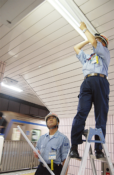 横浜市営地下鉄は今後3年間で、ブルーライン全32駅の蛍光灯のうち約3割を省エネ効果のあるLED照明(発光ダイオード)に交換する。その第一歩として、7月までに主要9駅の蛍光灯約2300本の照明をLEDに切り替え、夏場の電力不足に備える。