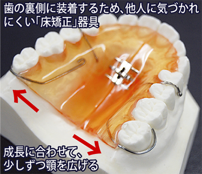 同院で主に行うのは、永久歯の成長に合わせて顎を広げていく「床矯正」。歯の裏側に装着した針金やネジを少しずつ動かしていくので、顎や歯への負担も少ないという。器具は取り外し可能で、見た目を気にせずに治療ができる。