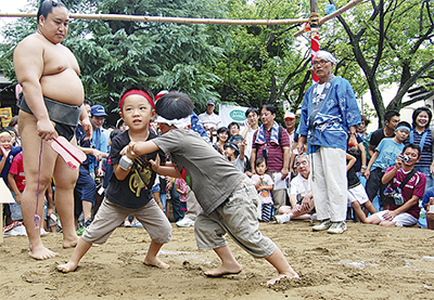 当日は地域の子どもたち約90人が参加。保護者が見守る中、園児や児童らは土俵で熱い戦いを繰り広げた。また、7町内会対抗の団体戦も実施。もみの木台自治会が優勝した。相撲に参加した関千紘君(4歳・もみの木台在住)は「勝った。嬉しかった」と笑顔で話した。