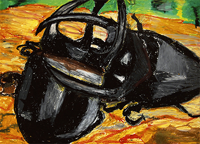 今回選んだ題材は夏休み中、友人や父親と近所の森で探し回った『カブトムシ』。家で飼育していたこともあり、色を重ねてカブトムシの光沢や立体感を表現した。「虫の絵が好きなのでこれからもたくさん描きたい」と岩井君は話した。