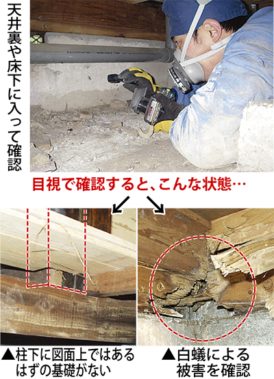 診断方法は”目視”が基本。建築士など有資格者が2〜3時間かけて天井裏、床下に入る。解析機は当然使用するが、図面だけでは分からない「シロアリ被害」や「基礎のひび割れ」「接合部の金物不足」など、細部に渡る検査が実施される。