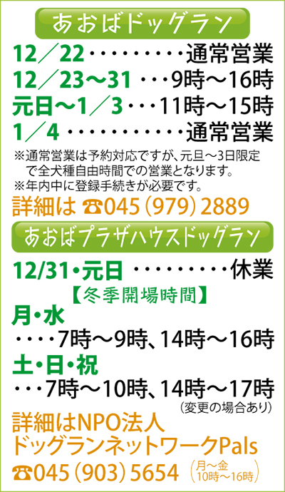 この時期、月、水、土、日、祝日の営業となっている「あおばプラザハウスドッグラン」は、12月31日(土)・元日(祝)のみ休業。2日(祝)からは通常営業となる。