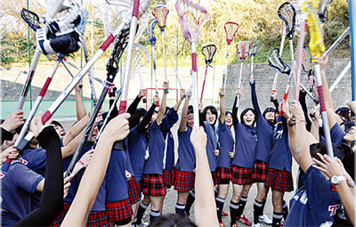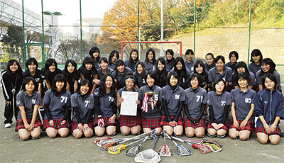 96年に創部した同校のラクロス部。練習場が確保できず、正規フィールドの約8分の1しかない狭い練習場で、部員50人がせめぎ合うように練習に励んでいる。「とにかくチームワークが抜群」。メンバーが口を揃えるように、明るい掛け声や笑顔が絶えない。1学年4・5人による小チーム”ソウルメイト”を編成し、年齢差を超えたチーム力を築いてきた。「学年が違っても、互いに意見を言える絆がある」とコーチ。涙も笑顔もともにした最高のチームで全国の大舞台に臨む。
