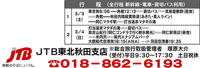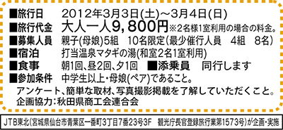 東京〜角館間の往復交通費込み、食事4回大人一人9800円。定員になり次第締切。
