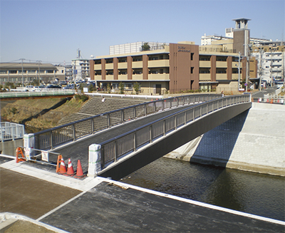 新設された橋は幅4m、橋長45・7m。歩行者、自転車専用で、夜間通行時はLED証明が点灯する。工事は平成22年5月から実施されていた。