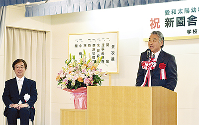 昨年冬に新園舎を竣工、移転した愛和太陽幼稚園(小泉議右園長・荏子田3の26の3)では、先月29日、新園舎竣工披露祝賀会が開催。地域住民ほか議員、関係者ら約100人で新園舎の完成を祝った。