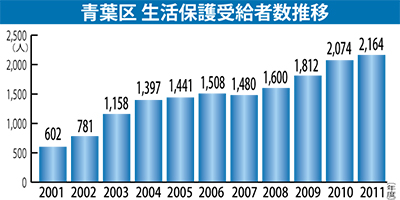市内で生活保護を受けている人は、2012年3月末で6万8296人。人口に対する受給者の割合は1・85%。青葉区は0・71%で、市全体に比べ低い割合となっているが、受給者数は10年前の602人から3・59倍の2164人に増加。これは市の増加率と比べて約2倍の数値で、市内18区中、最も高い割合だ。