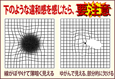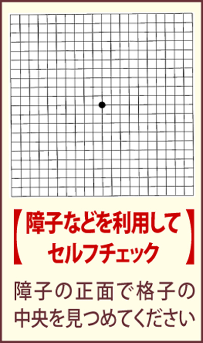 「このブルーライトの影響を受け続けると、将来的に、失明原因の第3位となる『加齢黄斑変性』に罹患する恐れがある」と理事長。これは、常に紫外線にさらされている網膜の「黄斑部」が、加齢とともに破壊され、いずれ画像を認識できなくなる病気。「例えば、和室にある障子の1点を見つめ、その格子がゆがんだり、部分的に欠ける、ぼやけるなどの症状があれば、一度、眼底検査をすることをお勧めします」。50代から症状が表われ始め、症状が進むと、視野が欠落したり、失明することもあるという。