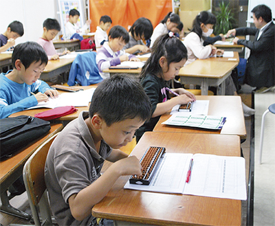 「願いましては36円なり、50円なり…58円では!」、「288!」―。聞き取るだけでも難しい速さで読み上げる数字を、瞬時に暗算する。市ヶ尾町のそろばん教室『青葉計算アカデミー』の一コマだ。実は今、そろばんの「数字を映像として扱う」訓練が右脳を鍛え、数的センスを磨くと注目される。