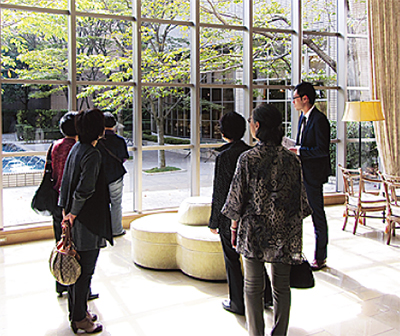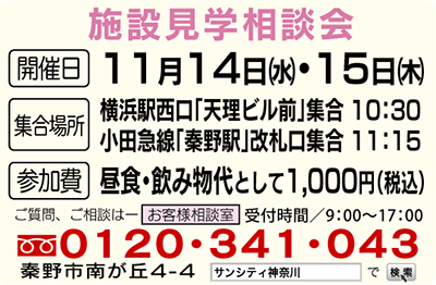 富士山、丹沢山塊の雄大な景色を望む秦野市に位置してリゾートホテルのような設備で注目される同館。当日は多数の参加者が集まり、施設紹介のDVD鑑賞、代表のあいさつの後、館内を見学。ダンスフロアもあるサンシティホールをはじめ、大浴場、温水プールなど充実の共有空間を見学した後、居室へ。ゆとりある室内は床暖房や生活センサー、無段差設計など、安心して毎日を過ごせる設備を備えている。24時間看護師が常駐するほか、敷地内にはクリニックも併設して、医療・介護体制も整えている。昼食は入居者と同様に予約なしで3種類のメニューから選べるレストランで旬の味を楽しんだ。