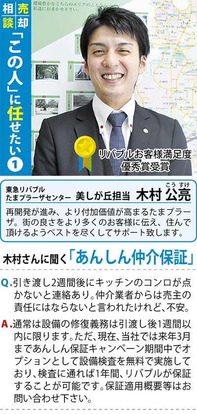 「築十数年の我が家。売却後、給排水管やキッチン設備などに不具合が出ないか心配…しかも売却直後の修繕費って売主負担と聞いたし、なかなか売却に踏み切れない」―。このように自宅売却を悩んでいる人に朗報。売却後主要な構造部位の木部の腐食、雨漏り、給排水管の故障、シロアリの害の「瑕疵(かし)担保責任」を負うべき箇所に不具合が生じた場合、修繕費用を保証する東急リバブルの『リバブルあんしん仲介保証』が解決してくれる。業界初のサービスとして10月に誕生した、今大注目の仲介保証サービスについて東急リバブルたまプラーザセンターに聞いた。