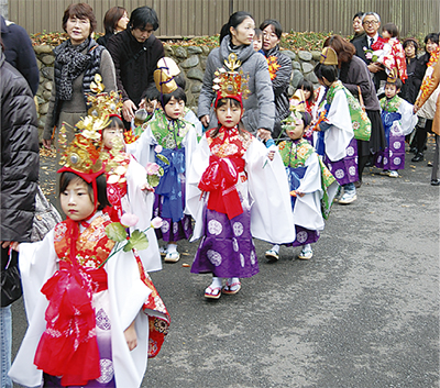 晋山式の前には稚児行列も行われ、鉄古典獅子舞や御囃子の音に導かれた稚児や梅花講員など大勢が参列。新住職の就任を祝った。