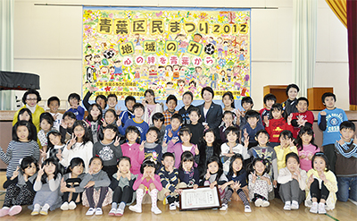 11月3日に行われた区民まつりの巨大壁画ポスター(=写真)を描いた鴨志田緑小学校の功績に対して、青葉区は15日、北原ふみ子校長へ感謝状を授与した。