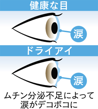本来、目の表面は涙に覆われて滑らかな局面を描いている。しかし、ドライアイの場合、目の表面から分泌する『ムチン』という物質が不足しており、均等に涙を保持できず、表面がデコボコになってしまう。そのため、目から入る映像が歪んで日や時間によって見えにくくなるのだという。