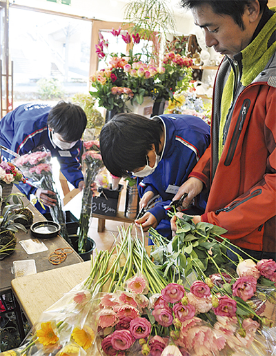 「花店 花葉」(奈良)では、生徒たちが店主の北野匡彦さんの指導を受けながら、茎の剪定や店内ディスプレイなどに挑戦した。「花という繊細な商品を扱うことの難しさや、色合いのバランスを知ってもらえれば」と北野さん。生徒たちは「予想以上に体力勝負の仕事だと感じた」と花屋で働く舞台裏について話した。