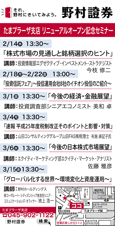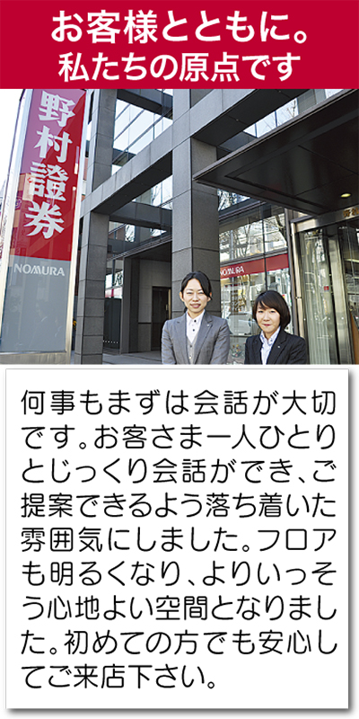 野村證券たまプラーザ支店が2月12日、リニューアルオープンする。今年で開設28年―。たまプラーザで「資産管理のサポート」や「幅広い金融サービス」の提供に努めてきた。現在の投資のこと、将来の資産設計のこと、初めての人でも「もっと相談しやすく」生まれ変わる。