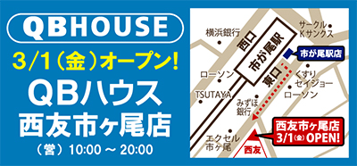”10分1000円”のヘアカット専門店『QBハウス』が3月1日(金)、市が尾駅東口を出て右にある「西友市ヶ尾店」1階にオープンする。