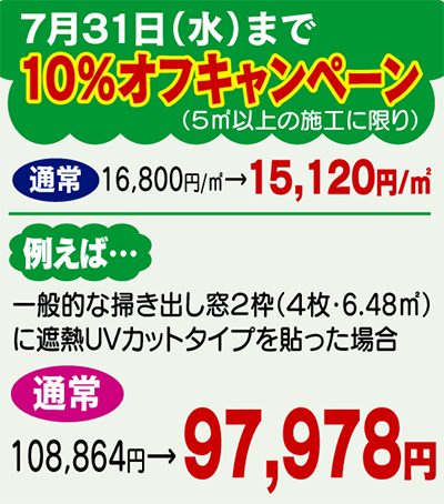今年、ダスキンでは創業50周年を記念し、7月31日(水)まで、この窓用フィルムが5平方メートル以上の施工に限り10%オフとなるキャンペーンを実施している。