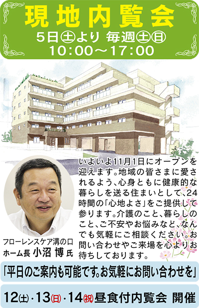 また12日(土)、13日(日)、14日(祝)には昼食付の内覧会を開催(予約制)。実際の食事を無料で体験できる貴重な機会。介護に関する個別相談も随時受け付けているので、気軽に問合せを。