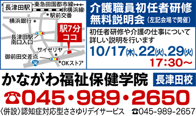 かながわ福祉保健学院では、9月より介護職員初任者研修(旧ヘルパー2級講座)の通信制コースをスタート。同研修は介護職に従事するための必須資格だ。通学・通信ともに開講キャンペーン価格として来年3月までは98000円を79000円(税込)に。また横浜市助成金や分割払いもあり。講義14日間(振替可)、会場は長津田教室(駅7分)。資料請求・問合せは【電話】で。★併設の認知症デイの利用も同時募集中(短時間利用で食事入浴OK)。