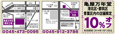 平成26年1月13日まで、3000円以上の商品は全国無料配送。港北区・都筑区・青葉区内の店舗は、本紙のクーポンでさらにお得になるという嬉しい特典付。