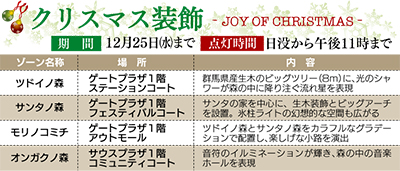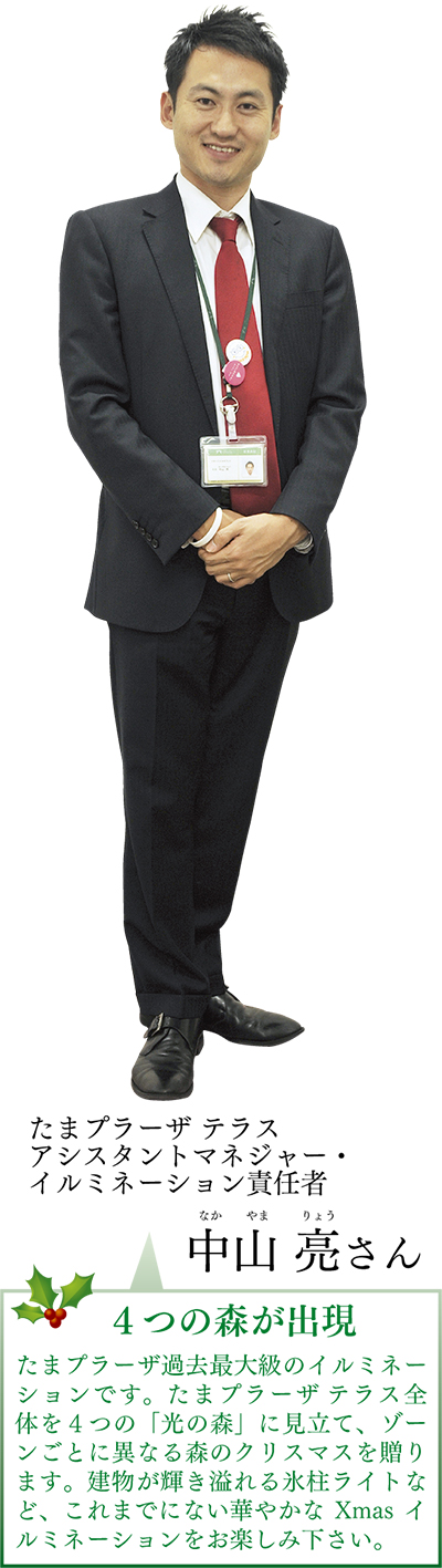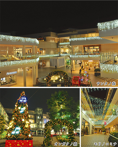 駅前広場のゾーン「ツドイノ森」では、群馬県の生木を使用した8メートルのビッグツリーがひときわ目を引く。ほかにもサンタの家や氷柱ライトによる幻想的な空間が広がる「サンタノ森」、音符のイルミネーションが印象的な「オンガクノ森」、光が降り注ぐ「モリノコミチ」と、各ゾーンとも個性的な装飾が楽しめる。イベント責任者の中山亮さんは「施設だけではなく、たまプラーザ全体を明るく華やかにしたい。美しが丘公園では11月30日(土)から毎年恒例のペアツリーイルミネーションを開催。併せてご覧ください」と話す。