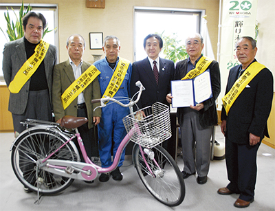 蕪木会長は「有事の際に、区民のために役立ててもらえば。今後も要望があれば、自転車の寄付を行いたい」と話し、徳江区長は「大変ありがたいこと。災害に強い街を目指したい」と話す。