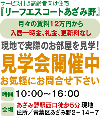 駅徒歩5分の好立地ながら「入居一時金、礼金、更新料なし」とは思えない暮らしを実現。開放感ある部屋、24時間の有人管理、救急通報対応の他、昼夜利用できるレストラン、デイサービス「セコムシニア倶楽部あざみ野」を併設するなどセコムのノウハウを最大限生かした、今までにない高齢者向け住宅として業界でも話題に。その全貌は報道番組でも取り上げられた。