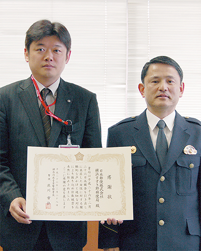 積極的な声掛けで振り込め詐欺の被害を未然に防止した横浜すすき野郵便局(金子浩之局長)に対して、青葉警察署(北川常弘署長)は3月28日、署長室で感謝状を贈呈した。