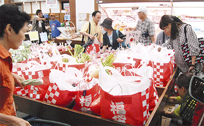 福袋に詰められたのはトマトやキュウリ、ナスなど旬の野菜で、加工品や菓子、果物なども販売された。緑区から訪れた加藤悦子さんは「毎月買いに来るが、いいものがたくさんあって楽しい。こういうイベントが増えれば」と話していた。