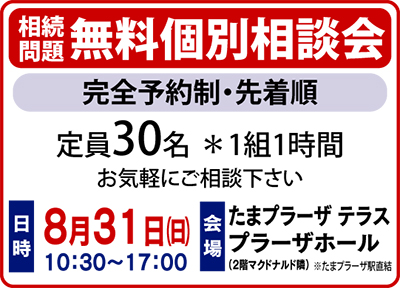 1組1時間、相続や不動産に関することなら何でもOK。定員30人で申し込み先着順。「地元で相談できる専門家に出会うチャンス。ぜひ足を運んでほしい」と同社。申込みはお気軽に。