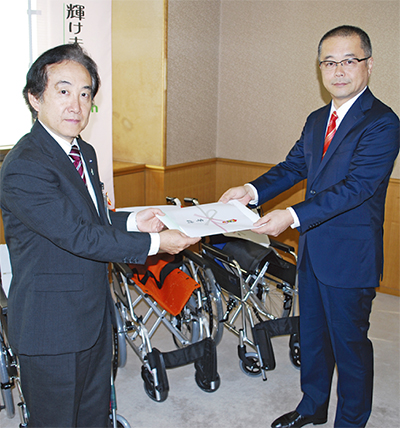 神奈川県を中心に介護施設を運営する(株)日本アメニティライフ協会(江頭瑞穗代表取締役)=本社・青葉区=は11月12日、区制20周年を記念して青葉区(徳江雅彦区長)に車椅子3台を寄贈した。