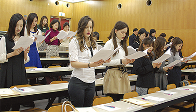 当日は10年度卒業生14人が参加。クロデット・ベルニエ学長は「この3年半の間に様々な経験を積み、多くの人と出会い、大きく成長したはず。カリタスの温かい交わりを楽しんで、明日に向かって新たな希望や力を得てほしい」とあいさつした。学位は当時、個別に授与されたため、式典では1人ひとりが壇上に上がり、教員からのメッセージを学長から手渡された。聖書の朗読や祈りなど、同大ならではのプログラムも用意され、学園歌をうたってしめくくられた。