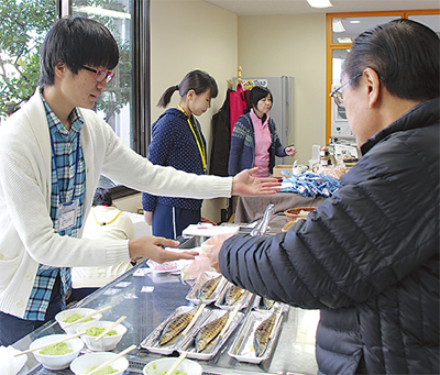 当日は震災時からの被災地の変遷や、仙台の生徒たちが行う観光PR活動を自らが紹介。手作りのずんだ餅も配った。イベントは日頃からボランティア活動を行うインターアクトクラブ(丹宗(たんそう)実優(みゆ)会長・2年)が計画したもの。メンバーは横浜南部市場と協力して、女川町で獲れたサンマを無料配布。地域住民約200人が訪れた。