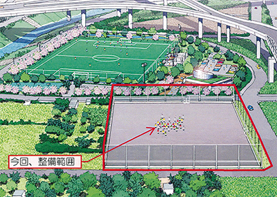 2009年春に開園した同公園には、サッカーなどに利用できる球技場や屋外バスケットコート、スケートボード広場などが南側に整備されている。今回の整備箇所は道路を挟んだ北側エリア。広場面積は約4800平方メートル(約60m×80m)となる見込み。市環境創造局によると、1月中にフェンスを設置しグラウンドの造成作業を行う予定。3月末までに舗装を終了させ、4月のオープンを目指す方針だ。「(貸し切り利用日以外は)基本的に公園利用者が使える広場になる」と市担当者は話している。