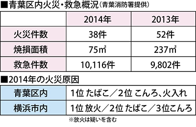 青葉消防署は2014年の火災・救急件数を公表した。区内の火災件数は38件で前年より14件減少。横浜市内の火災原因1位は放火だが、区内はたばこがもっとも多かった。救急車の出動件数は1万116件で前年より314件増加。救急件数は市内18区中15区で増加しており、同署警防課は高齢化もひとつの原因とみている。
