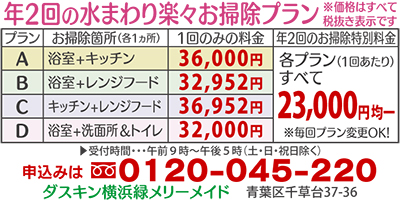 丁寧でキレイな仕上がりが評判のお掃除代行のプロ、「ダスキン横浜緑メリーメイド」では今、「新メニューデビューキャンペーン」を開催中。主婦の声に応えて、「年2回の水まわり楽々お掃除プラン」を新しく同店限定で実施。1回のみと比べると今だけ最大約38%引きに。作業時間や汚れ具合に関わらず、全て均一料金で、さらに毎回プランが自由に選べるのも魅力。申込みは4月20日まで。
