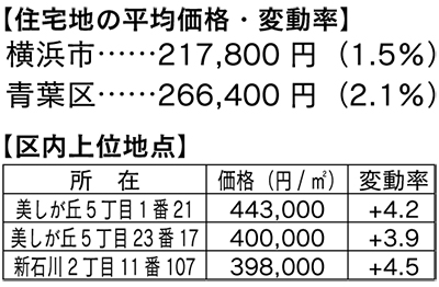 青葉区内では住宅地34地点、商業地6地点で調査。住宅地の平均価格は26万6400円(変動率2・1%)と市内3位で、商業地は42万5200円(同2・0)だった。住宅地では、継続地点33地点のうち奈良町字竈谷の横ばいを除く32地点全てで上昇。特に「美しが丘5丁目1番21」は44万3千円(同4・2)で市内3位、県内でも4位に入った。他にも美しが丘5丁目、新石川2丁目にある3地点が県内10位に入るなど、たまプラーザ駅徒歩圏内の上昇が目立った。また、新石川2丁目は上昇率でも市内3位となるなど、価格高位の地点の上昇が目立ち、市都市整備局は「富裕層の高額物件に対する需要が顕在化した」としている。