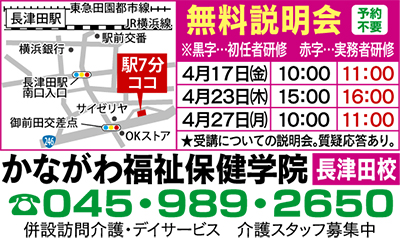 長津田駅徒歩7分で通いやすさ抜群、かながわ福祉保健学院では介護職員初任者研修を随時開講。通学・通信コースともに79000円(税込)とお手頃料金の上、分割払いや全額キャッシュバック制度も。最短で講義14日間(振替可)に出席、修了評価試験70点以上で資格取得OK。人手不足の為、パート勤務で時給千円以上の職場も多い。