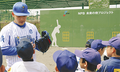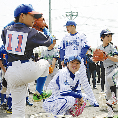 筒香、山崎両選手はボールの投げ方や打撃などを参加者に指導。筒香選手は「一番大事なのは野球を楽しむこと」と語りかけた。始球式を終え、郷家さんは「すごく緊張したけど、ボールが壁に当たって嬉しかった」と感想を話した。