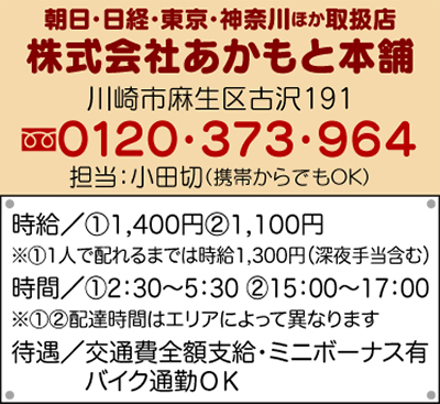 すすき野や黒須田エリアの新聞販売店「あかもと本舗」は配達スタッフを募集中。主婦や学生も活躍中で「笑顔で働ける職場です。初めてでもサポートします」と担当の小田切さん。電話連絡の上、履歴書持参を。