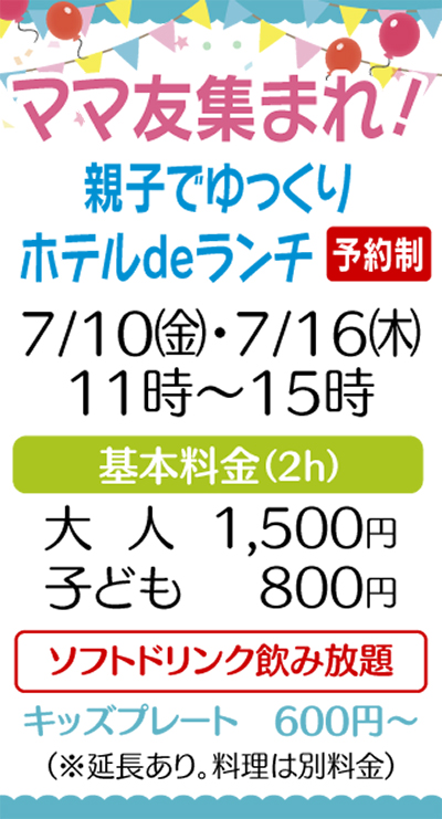 子どもが多いという青葉区の地域性を考え「周囲に気兼ねなく、お子様を連れてママ友ランチを」と、宴会場にキッズスペースを設け、フリードリンク付の2時間制(料理は別料金)プランを企画した。同ホテルは「ミシュランガイド横浜・川崎・湘南2015特別版」にも掲載されている。