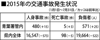 青葉署によると7月31日時点で、人身事故件数は前年比15件増の480件、死亡事故は3件増の5件、負傷者は25人増の571人となっている。県内全体では、人身が573件減(1万6547件)、死亡は5件減(98件)、負傷者は522人減(1万9664人)と減少傾向にあるが、同署管内での状況は、すべてにおいて増加している。